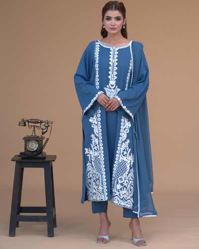 Elevate your elegance with Azur, a stunning formal ensemble crafted from luxurious crepe georgette that drapes beautifully and feels soft against the skin.