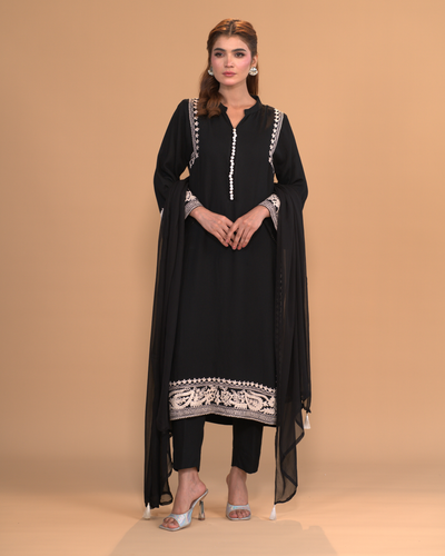 Graceful and understated, crafted from soft crepe georgette with delicate lace and embroidered motifs. A balanced look for sophisticated evenings.
