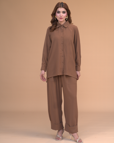 Minimal yet powerful — this crepe georgette co-ord redefines modern elegance with its clean silhouette and effortless sophistication.