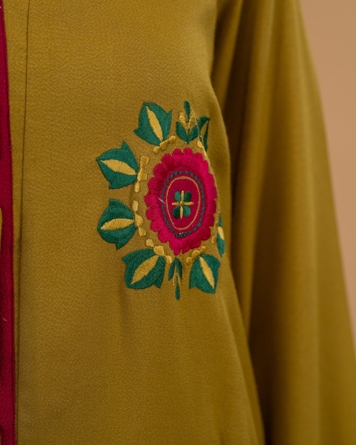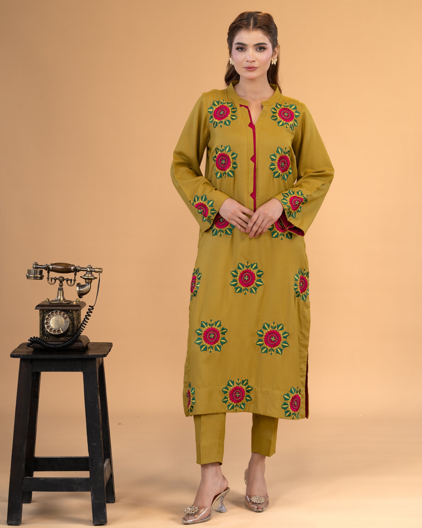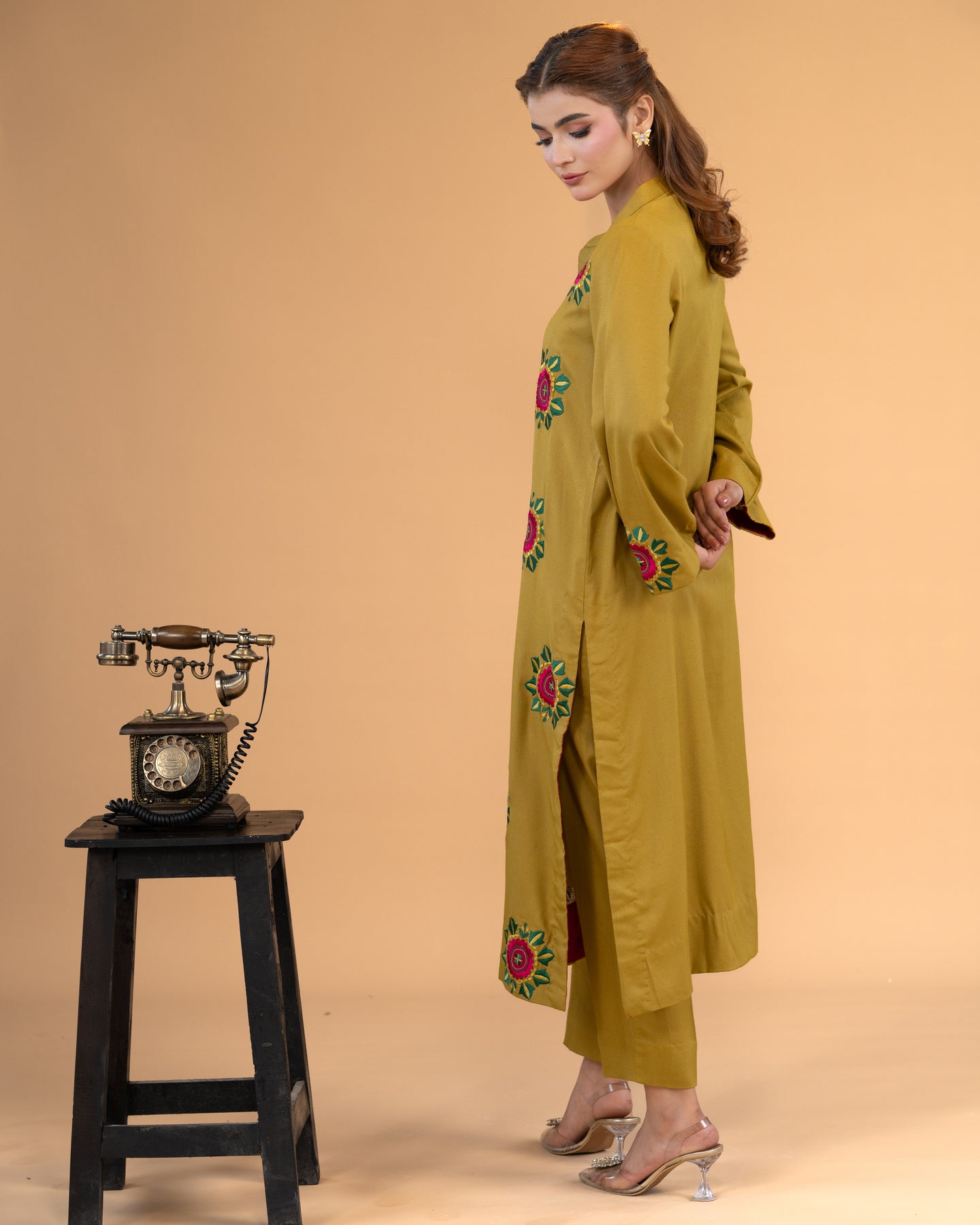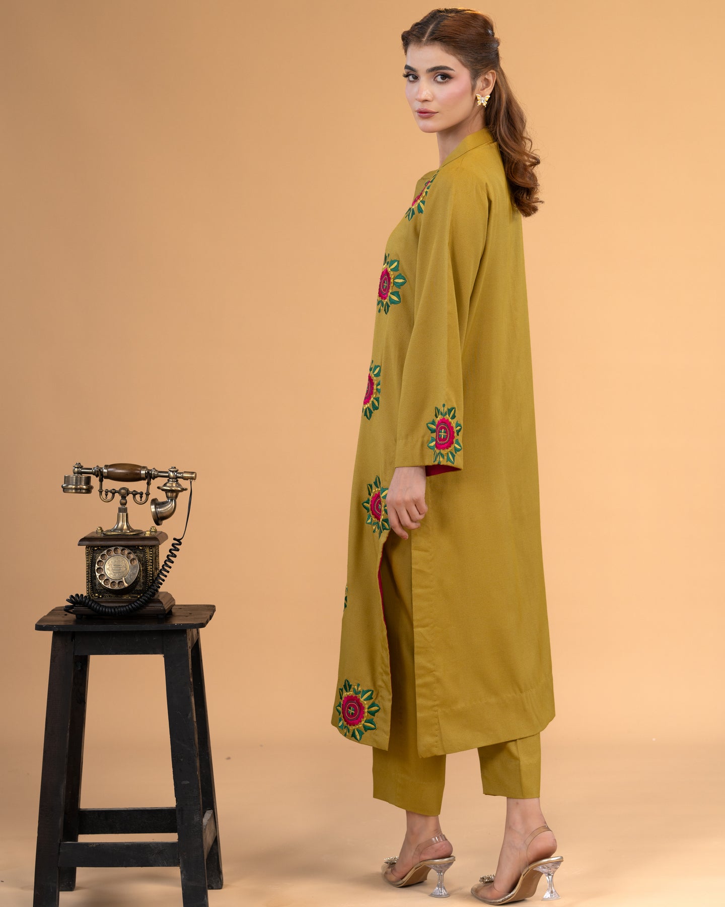 Brighten up your wardrobe with Helen, a statement formal co-ord set crafted from premium tropical karandi that offers structure, comfort, and sophistication. This radiant design features intricate pkki embroidery with appliqué work, creating a perfect harmony of craftsmanship and color.
