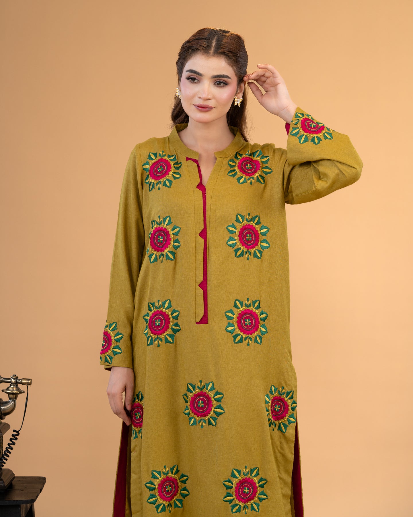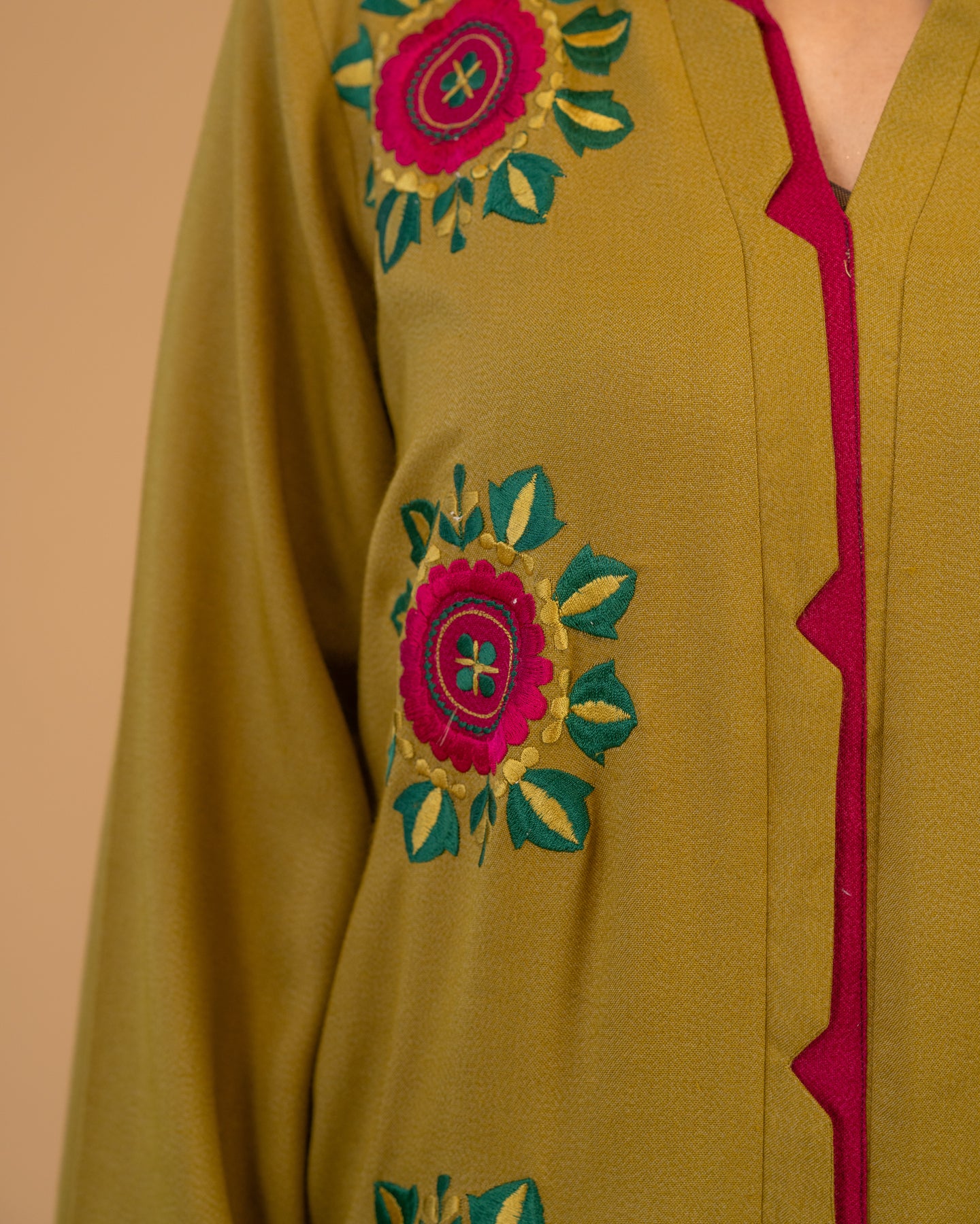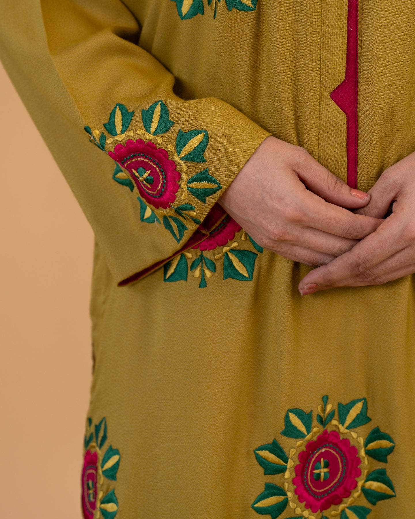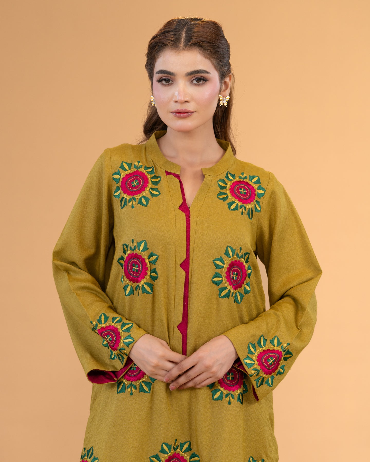 Brighten up your wardrobe with Helen, a statement formal co-ord set crafted from premium tropical karandi that offers structure, comfort, and sophistication. This radiant design features intricate pkki embroidery with appliqué work, creating a perfect harmony of craftsmanship and color.