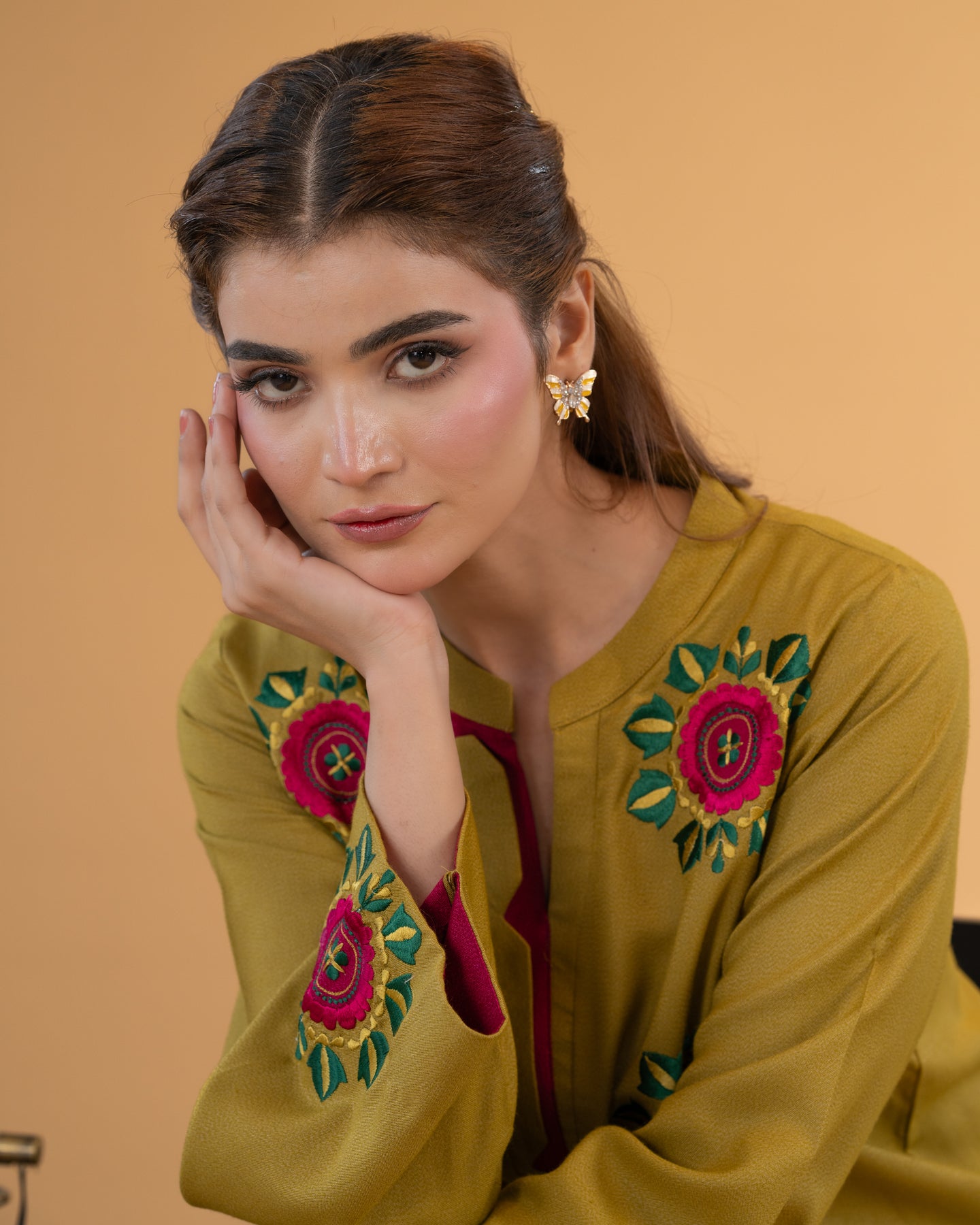 The vibrant hue is beautifully balanced with a chiffon dupatta, dyed in a stunning gradient that enhances the outfit’s modern yet traditional charm. Paired with straight pants, this ensemble delivers a smart, sleek silhouette ideal for festive gatherings, daytime events, or elegant casual wear.