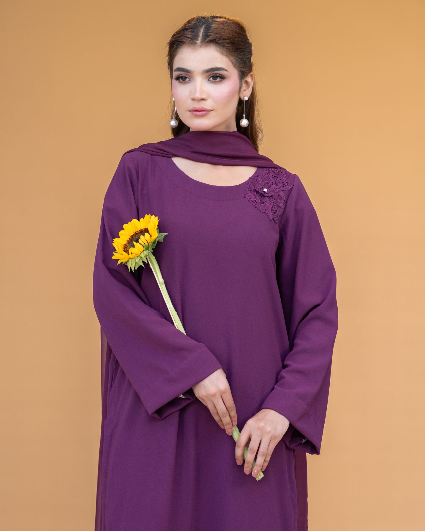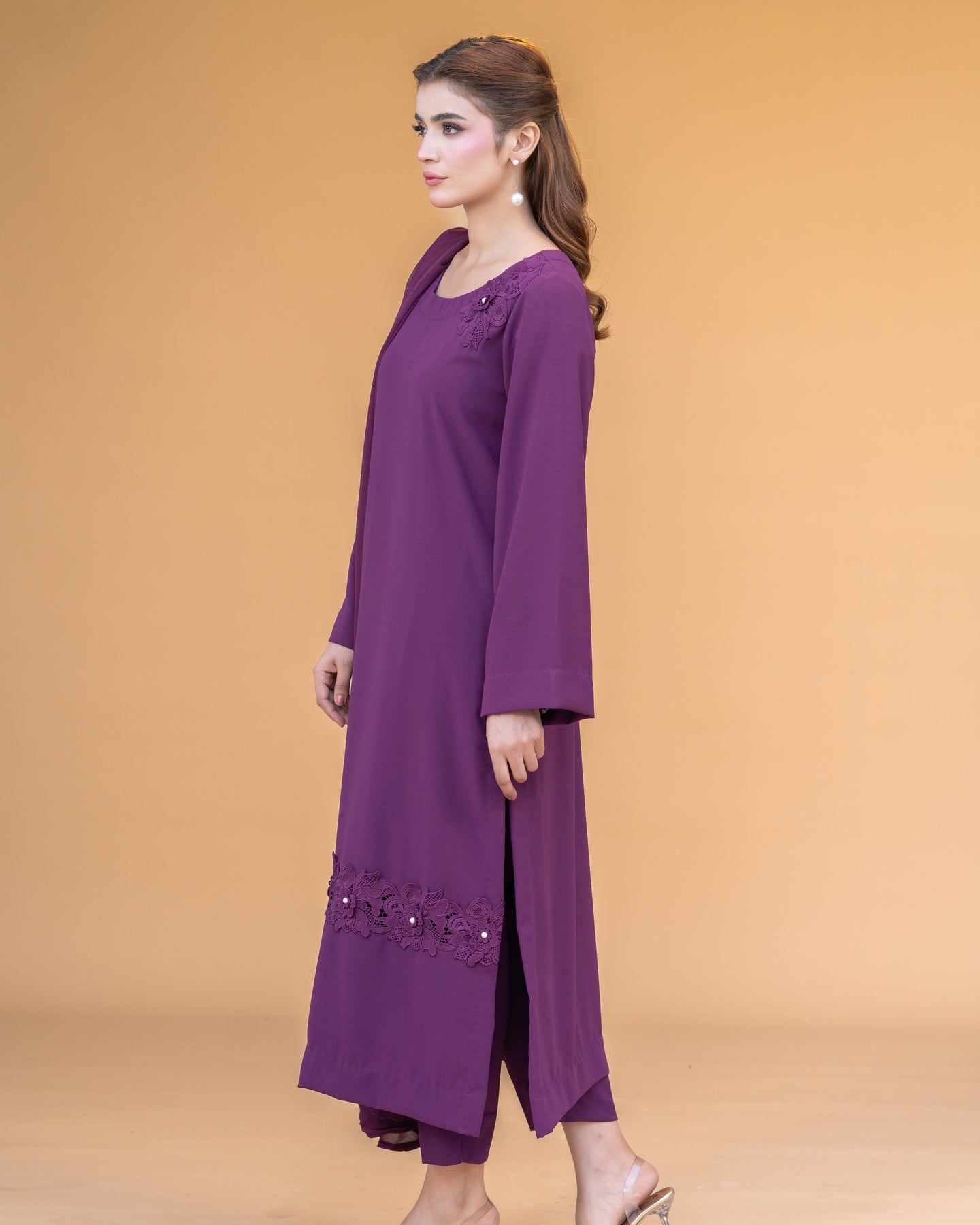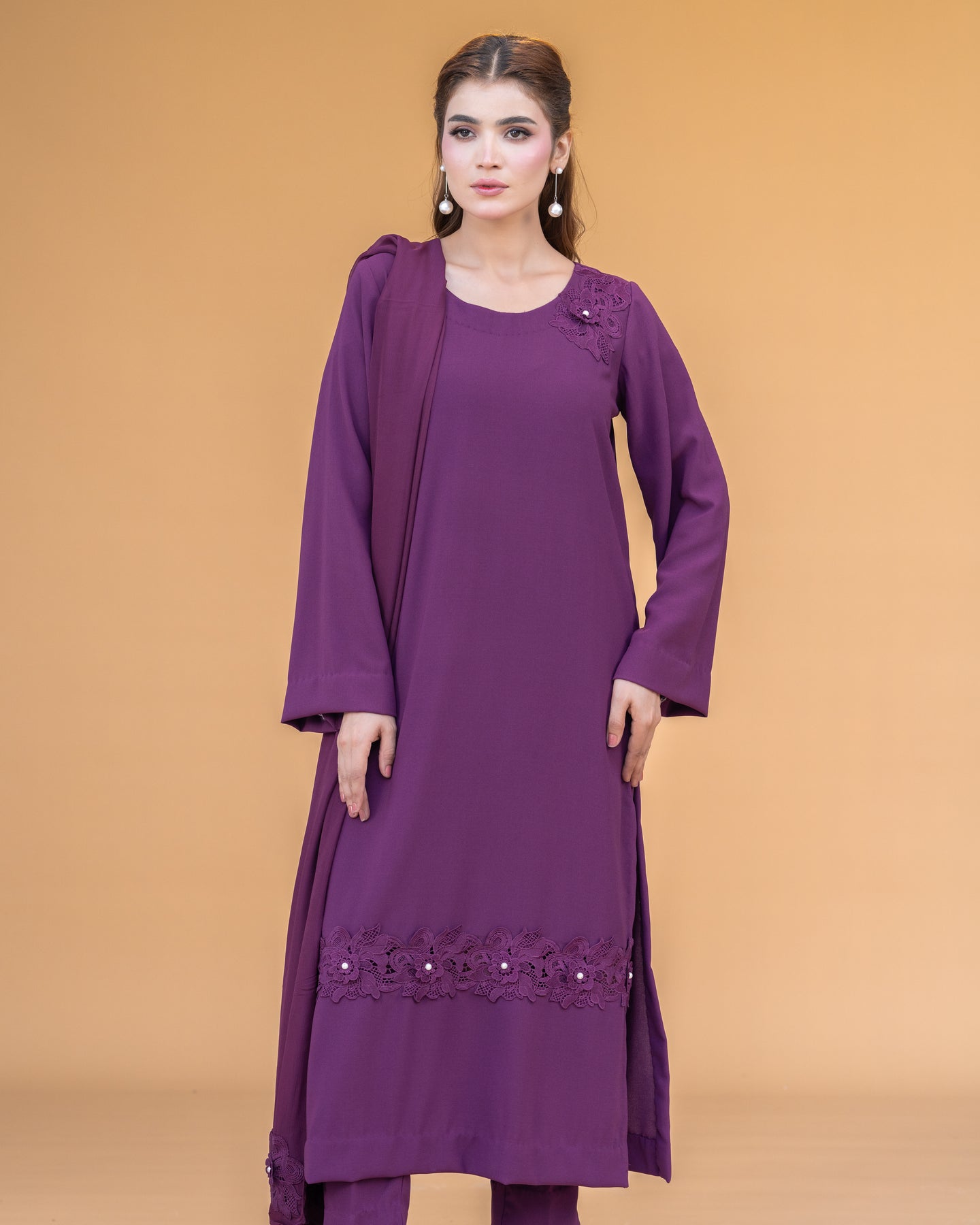Paired with straight pants, this ensemble offers a sleek silhouette that complements the airy elegance of its chiffon dupatta. Perfect for formal dinners, festive occasions, or semi-formal gatherings, Vienna exudes understated grace with a modern touch.