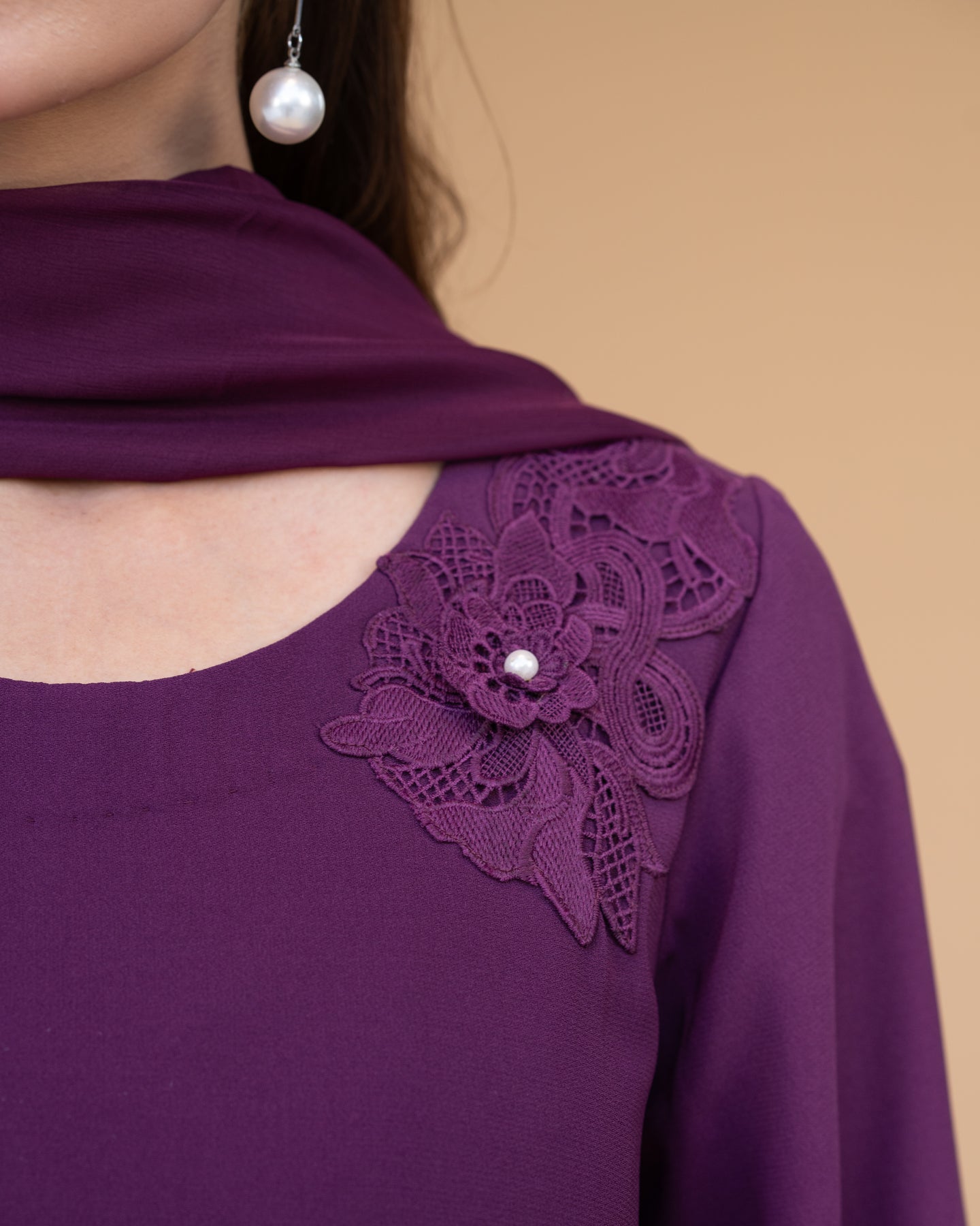 Bring timeless charm to your wardrobe with Vienna, an elegant formal ensemble crafted from luxurious crepe georgette for a smooth, flowy drape and refined finish. The outfit features beautiful lace detailing on the daaman and delicate motifs on the neck and dupatta, creating a harmonious balance of simplicity and sophistication.